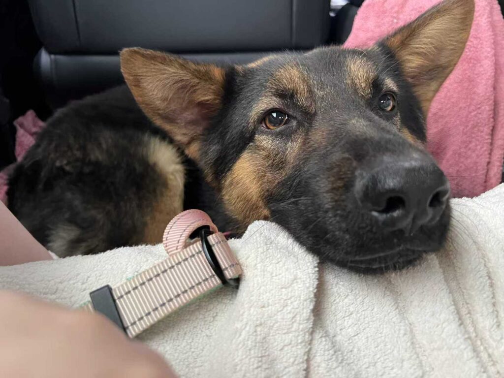 The new owner introducing herself to Yoyo, he is very tired, he has had a very big few days.